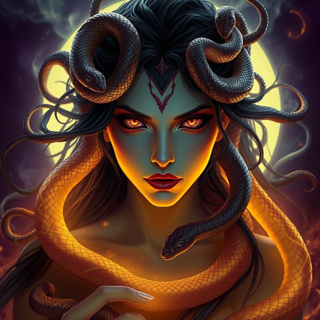 A striking picture of Lilith, queen of darkness, with snakes in her hair and a fierce gaze. The image is presented as concept art with Art Nouveau and dark fantasy elements, using dramatic lighting and a rich color palette.