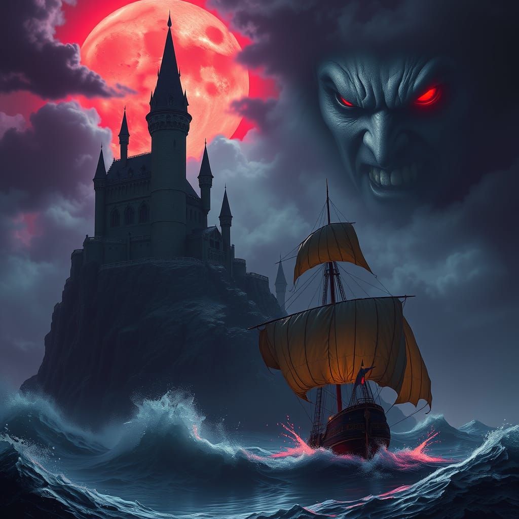 A dramatic image of Dracula's castle perched on a cliff under a blood-red moon. A ship fights a stormy sea as Dracula's face appears in the clouds in a dark fantasy style.