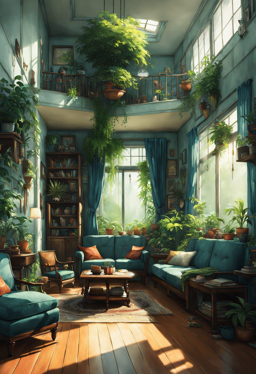 A bright living room filled with lush green plants and bathed in sunlight. This vibrant anime-style image, rendered in high resolution, features natural lighting and a triadic color scheme.