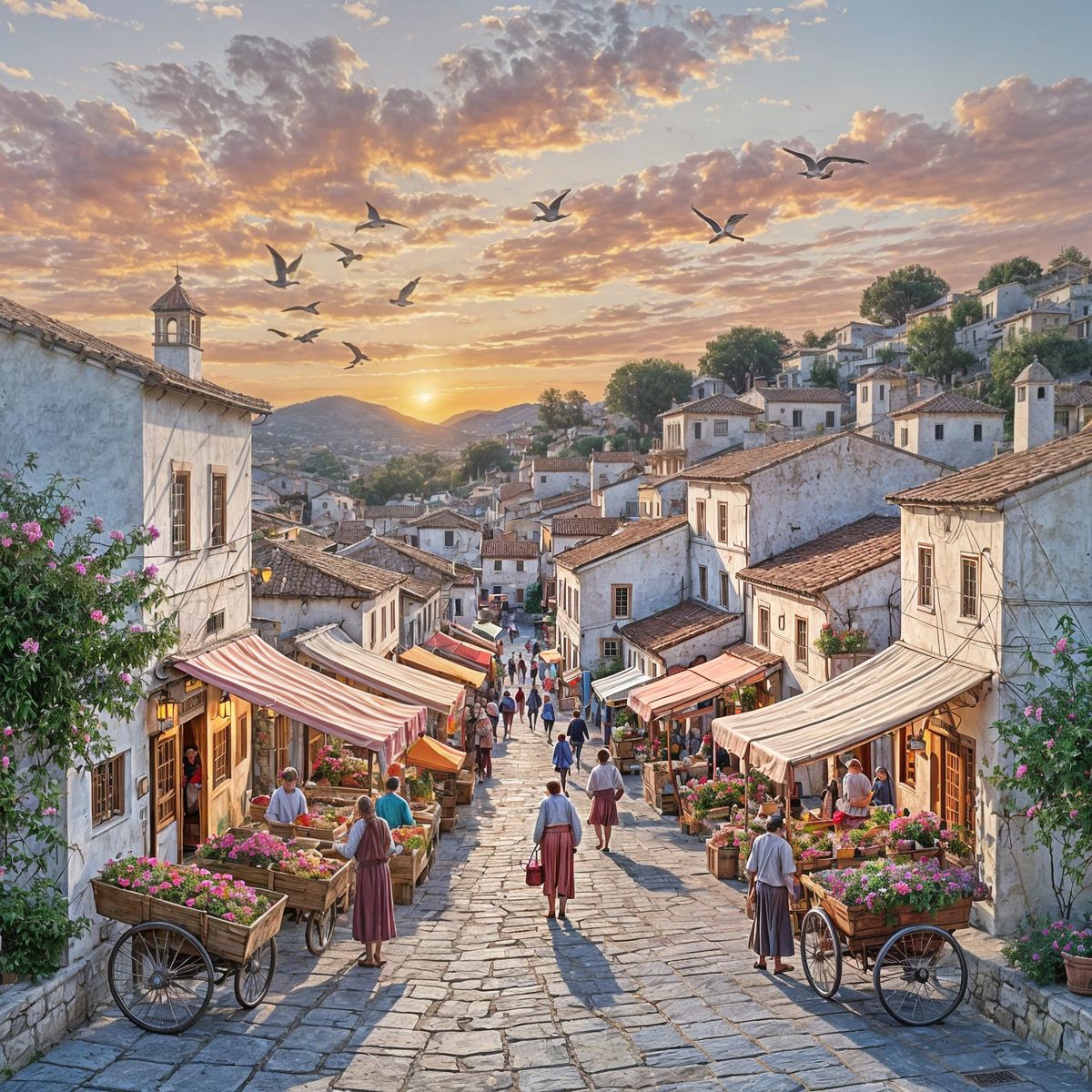 A vibrant watercolor of a bustling Mediterranean marketplace at sunset. The image features traditional white stone buildings with red tile roofs, vintage wooden stalls, and a warm, golden light.