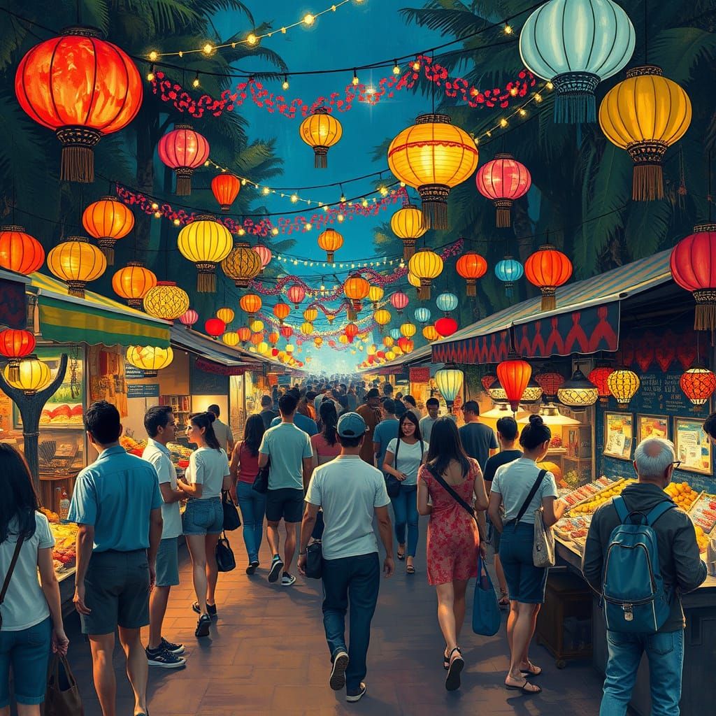 This image shows a vibrant night market filled with people and colorful lanterns. The scene is reminiscent of impressionist paintings, capturing the lively atmosphere and diverse offerings of street food and handmade goods.