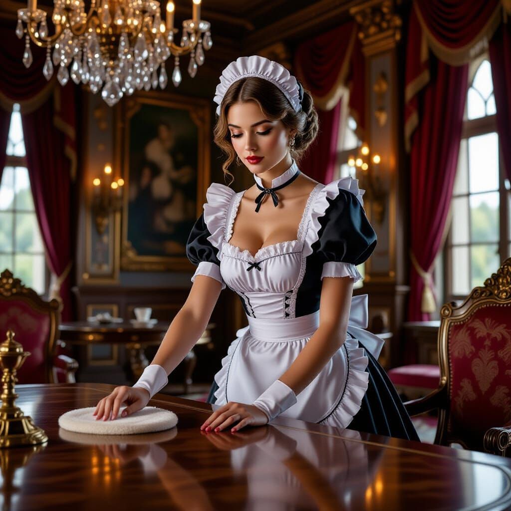 This image shows a maid in a detailed outfit polishing furniture in a castle. The hyper-realistic style evokes digital artwork with rich details and textures.
