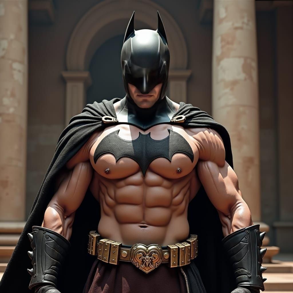 This image shows a muscular man resembling Batman in ancient Rome. He wears Roman Centurion clothing and is depicted without his mask in a hyperrealistic style.