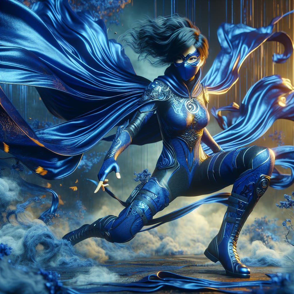 This image shows an Asian superheroine in a blue suit, cape, and boots, her identity concealed by a mask. The artwork is high-definition fantasy concept art in complementary colors.