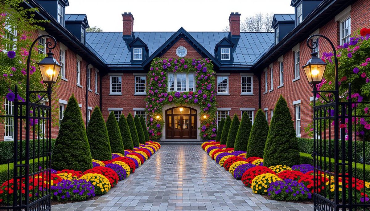 This image depicts a unique two-story school resembling the letter "B," set in a magical alleyway with glowing blue-green spruces. Colorful flowers surround the fairy-tale like building adorned with clematis.