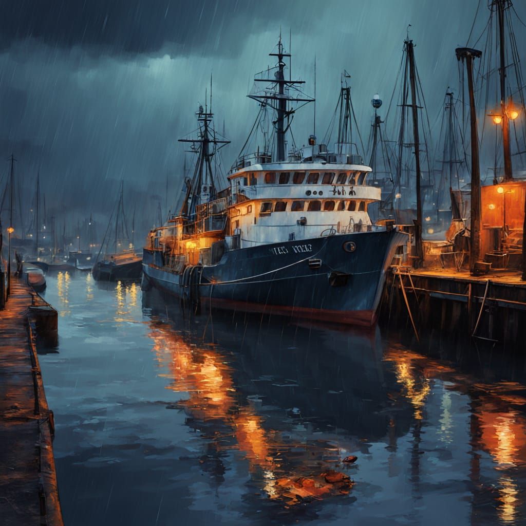 Easily generate your own gloomy evening seaport images with our free AI generator. Add rain, blurred lights, and quays.