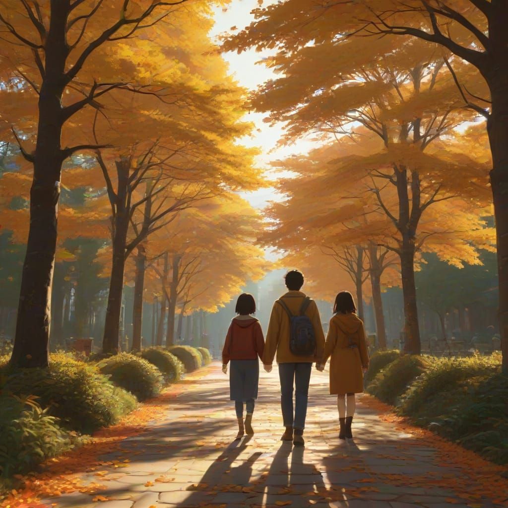 This image shows a couple walking through a park in autumn. The vibrant leaves and soft natural lighting create a cozy and serene atmosphere, in a Studio Ghibli-style anime aesthetic.