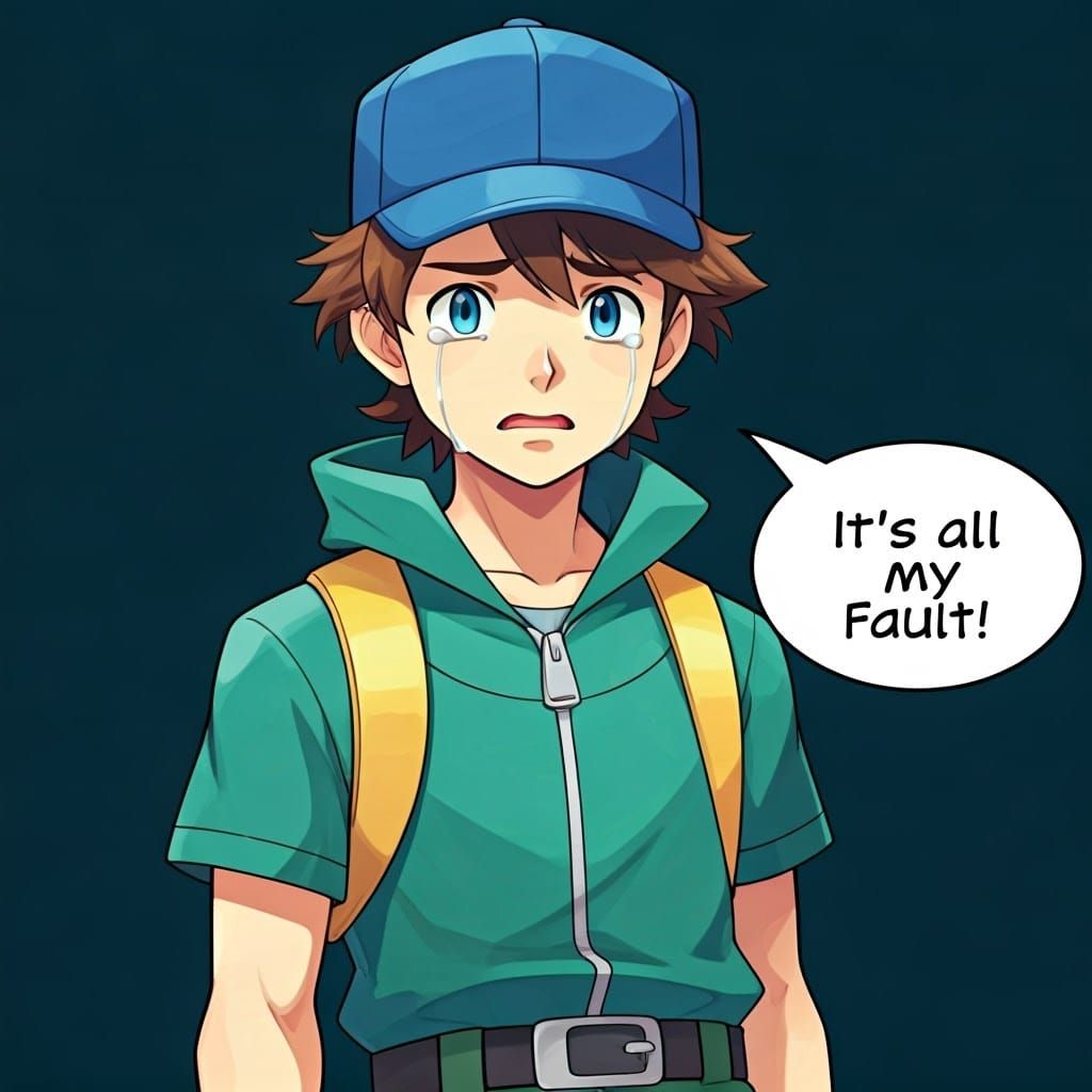 A close-up image shows a distraught Pokémon trainer with tears in his eyes, exclaiming, "It's all my fault!" The artwork blends comic art styles and vibrant colors with digitally rendered textures.