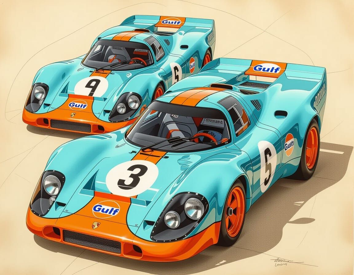 This image shows a hyperrealistic sketch of a Porsche 917K in Gulf livery, drawn with precision on parchment, evoking timeless design and engineering genius.