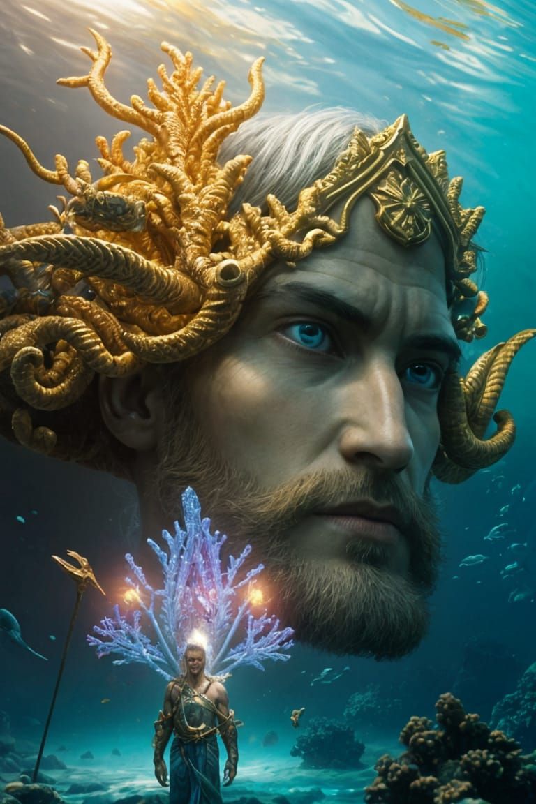 A vivid image of King Neptune on his coral throne, holding a golden trident. The portrait features dynamic lighting and intricate details in a hyperrealistic style.