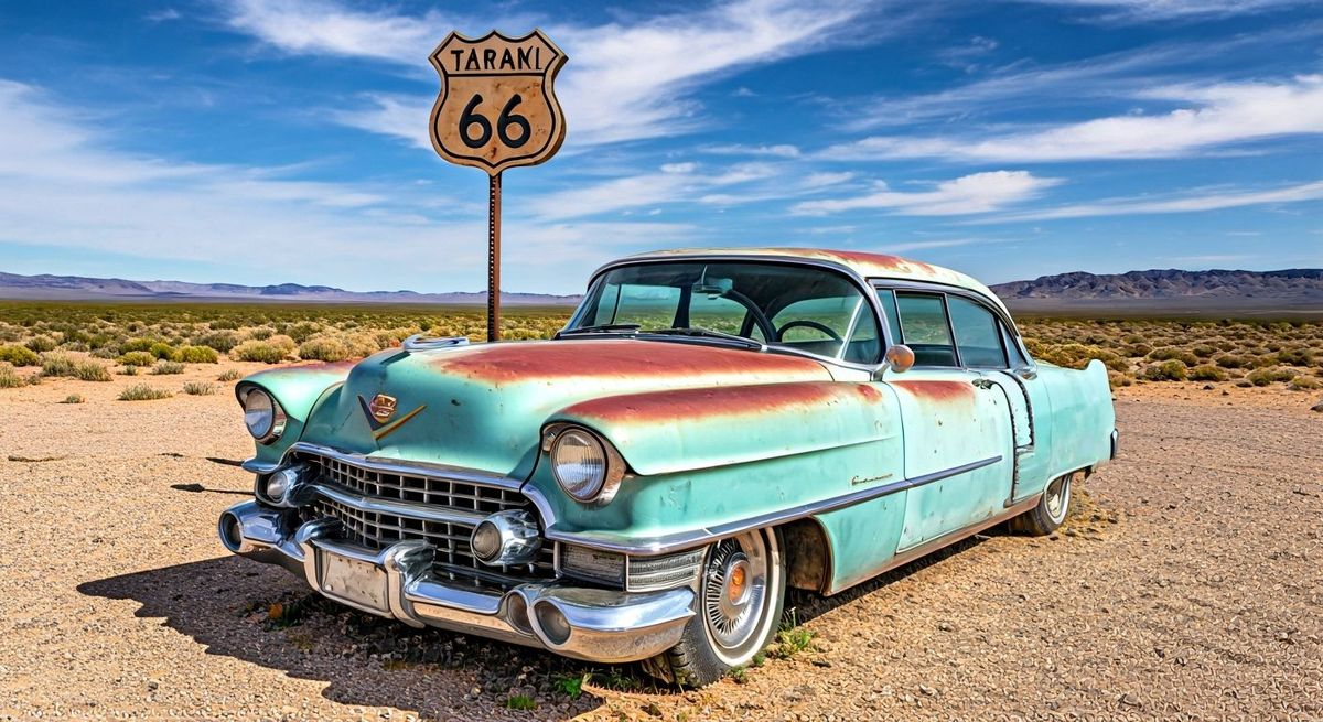 This image shows a weathered 1953 Cadillac Eldorado parked near a vintage Route 66 sign. Shot in a photojournalistic style, the image captures the Americana aesthetic of the desert landscape under a clear blue sky.