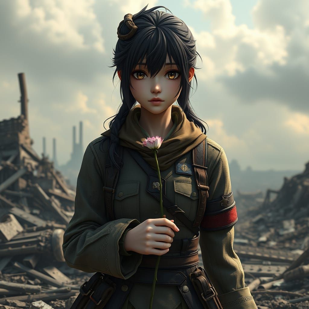 A powerful 3D anime art piece depicting a young woman standing proudly amidst a devastated landscape, cradling a wilting flower as a symbol of sacrifice for LIBERTÀ, with intricate details and cinematic quality reminiscent of Genshin Impact