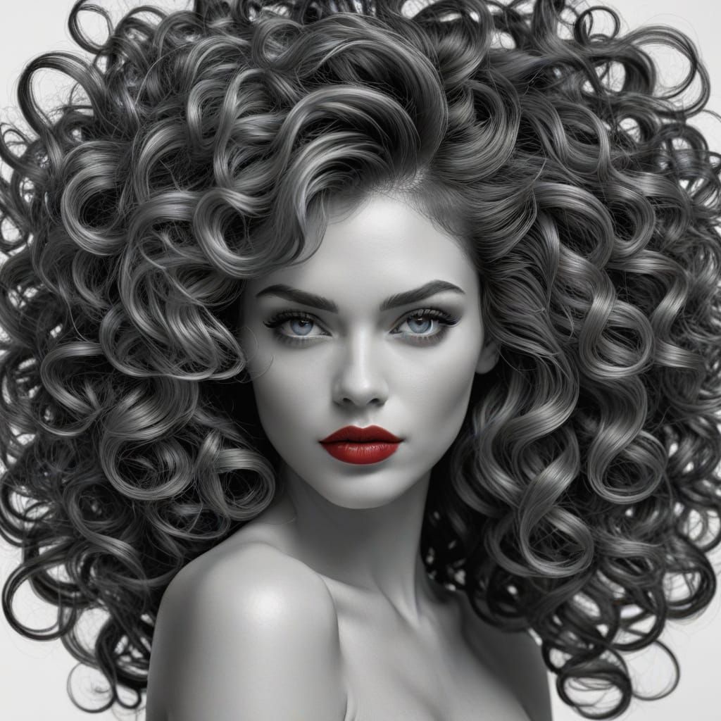 A woman, adult age range, light skin tone, Caucasian ethnicity, features striking, voluminous, dark gray-black hair styled in large, dramatic curls. Her gaze is direct and confident, conveying a strong, empowered mood. She wears full, bold, rich red lipstick and styled eyebrows. Large, expressive, ...