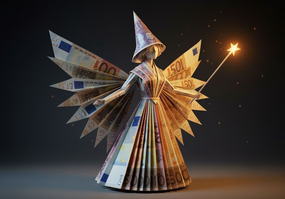This 3D sculpture depicts a fairy godmother crafted from euro banknotes, with wings of folded currency and a glowing pound note wand. Rendered in a radiant fantasy style reminiscent of Nordic art.