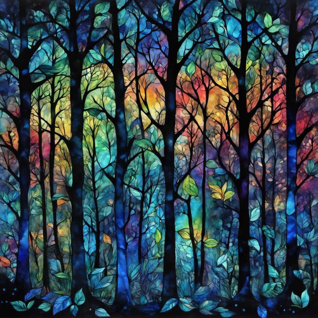 This image showcases a mystical forest with velvet leaves on trees, rendered in a vivid stained glass style. The scene is set against a deep midnight blue sky filled with shimmering starshine.