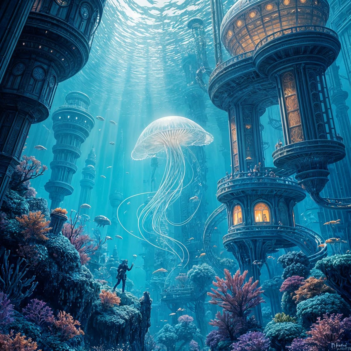 A glowing jellyfish floats through a futuristic underwater metropolis. This image features a bustling civilization amid glass and metal structures, coral reefs, and diverse marine life. The artwork is reminiscent of Art Nouveau.