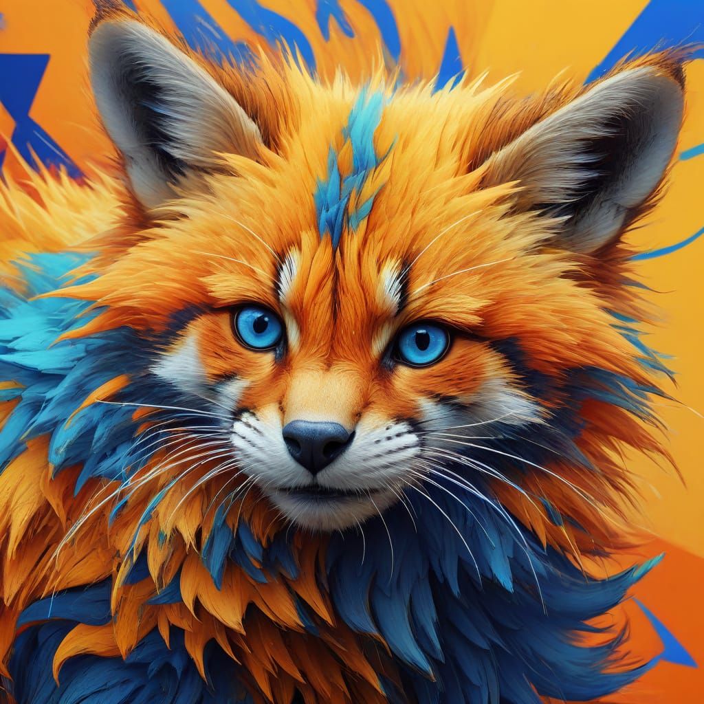 This image shows a close-up of a funny creature with vibrant orange fur and electric blue accents, set against a dynamic yellow background with a warm color gradient, in a style reminiscent of Fauvist digital paintings