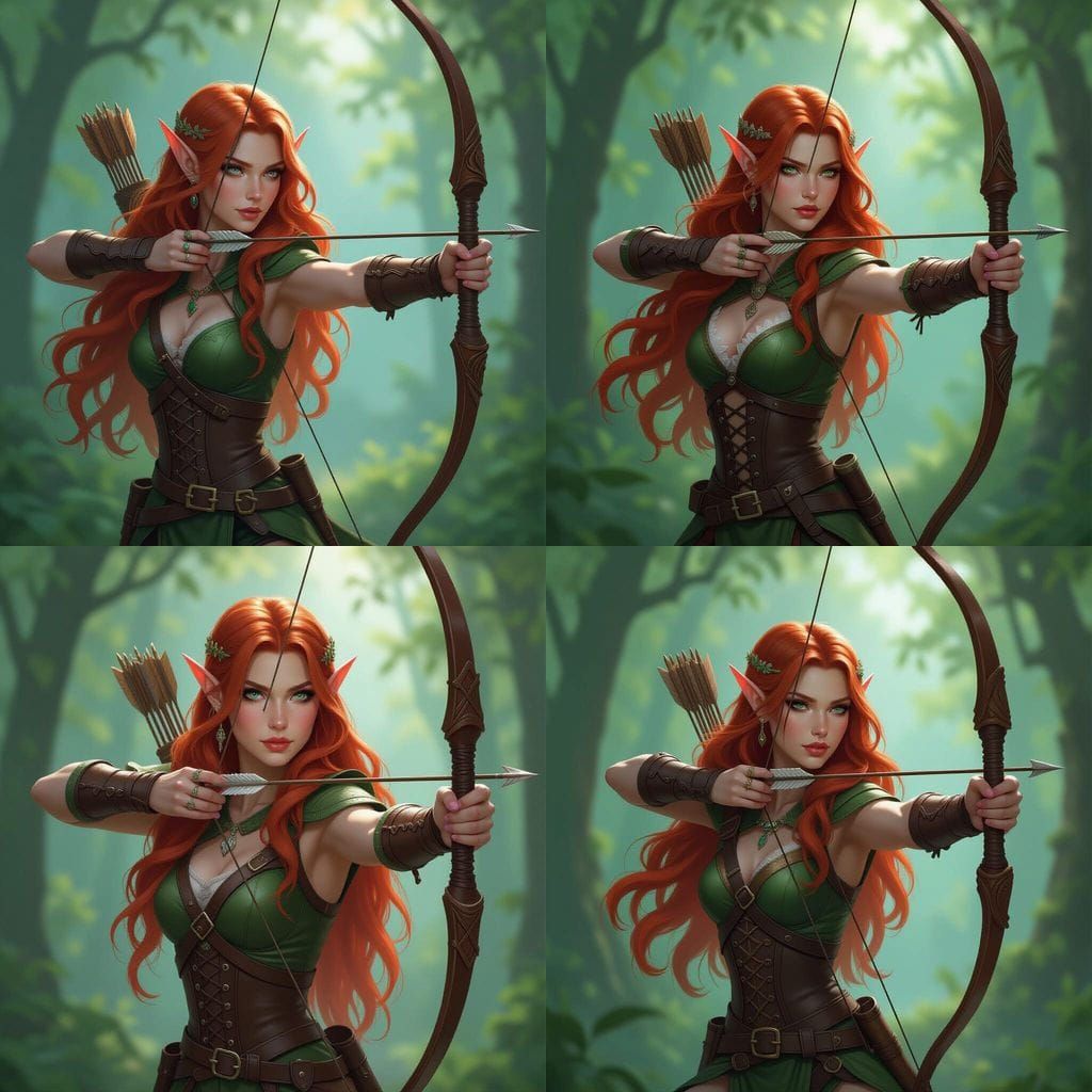 A striking image of a red-haired forest elf archer in a magical forest. She is equipped with elven gear and leather armor. The portrait features dynamic lighting and intricate details, rendered with triadic colors.