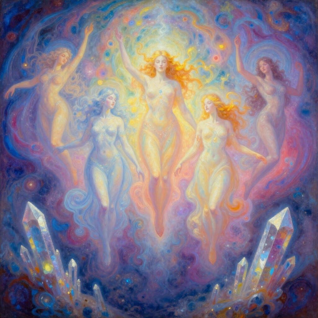 This image depicts immortal deities joyfully exploring serene, luminescent realms filled with nebulae and crystal structures. Rendered in a vibrant, otherworldly oil painting style, it evokes boundless freedom and peace.