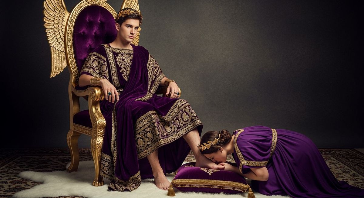 This image shows a young Roman emperor seated on a throne, receiving homage. The scene is depicted with sharp focus and natural lighting, reminiscent of classic court photography.