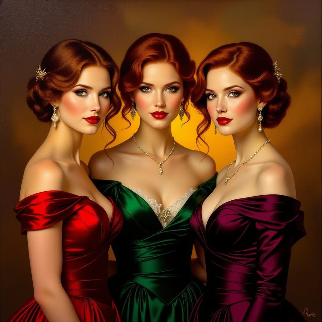 This oil painting features three women with distinct hair colors and jewel-toned gowns, bathed in dramatic golden light. Rendered in a detailed Baroque style with an opulent palette.