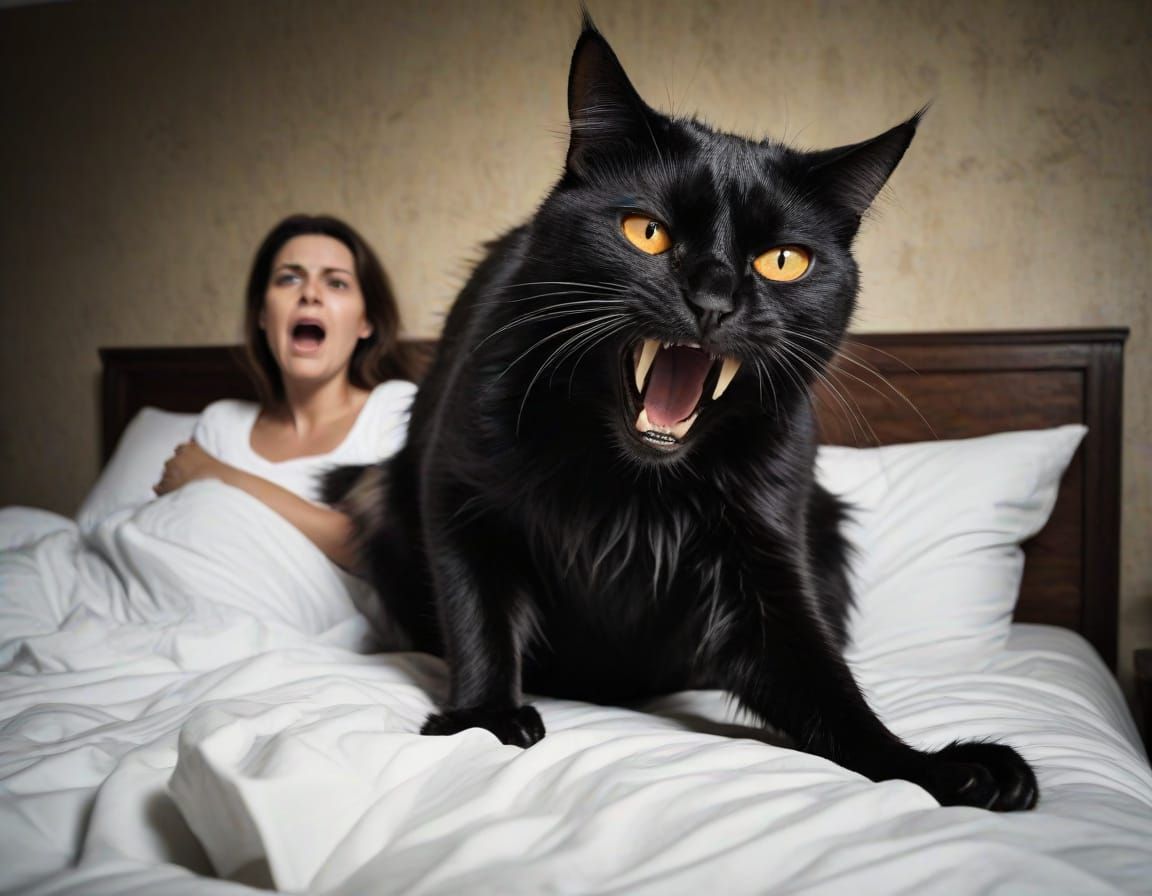 This image depicts a man in bed, seemingly suffering, while his concerned wife looks on. A black cat flees the scene in the dark, messy bedroom. The scene has a grungy aesthetic.