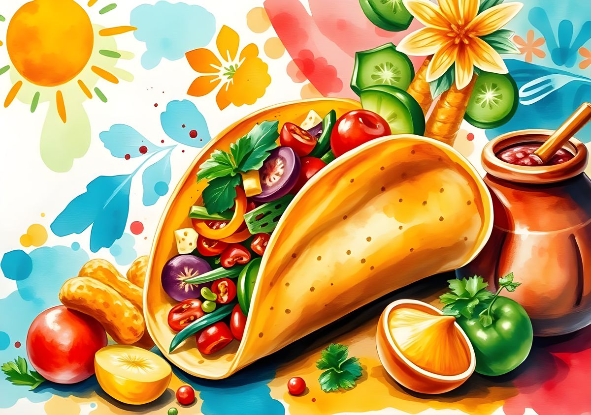 Vibrant watercolour masterpiece celebrating Mexican cuisine,