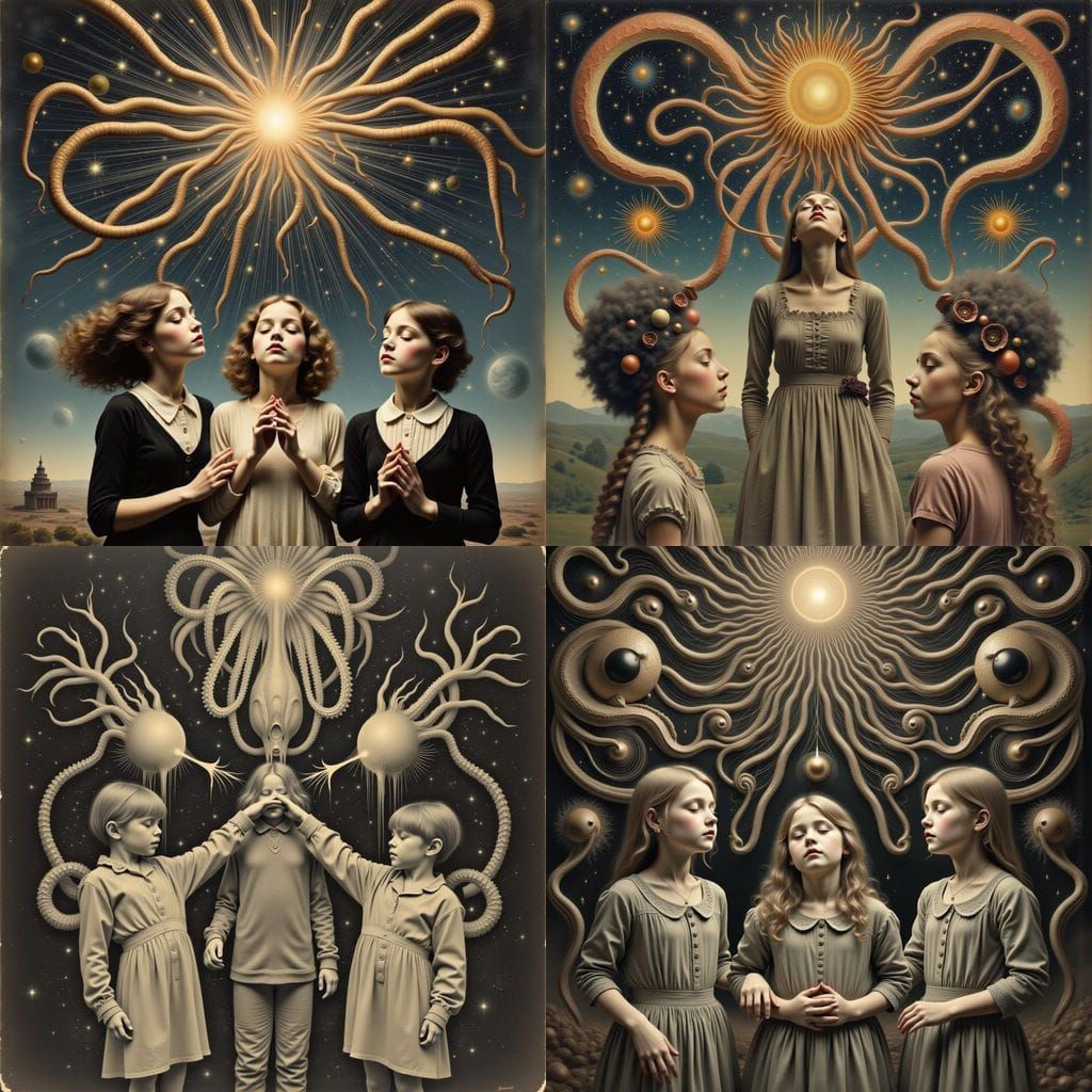 This image features three young schoolgirls with closed eyes, depicted in a vintage cosmic surreal style. They are receiving wisdom from overlapping cosmic horror tentacles and electromagnetic waves, creating a celestial noir photo collage.