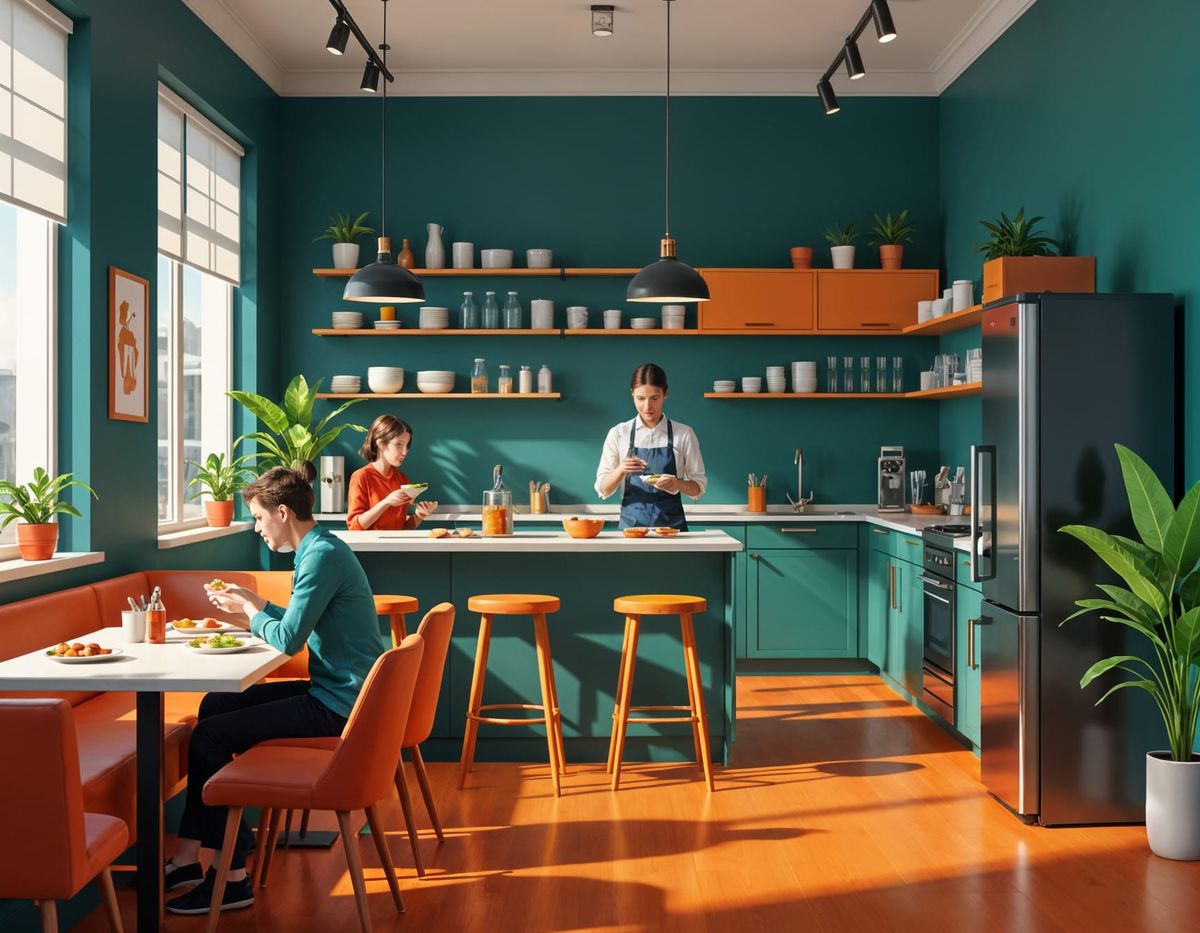An ultra-realistic depiction of a modern office canteen featuring a kitchen island and fridge. The interior showcases a striking contrast between dark teal walls and brown-orange flooring, with office workers enjoying their lunch.