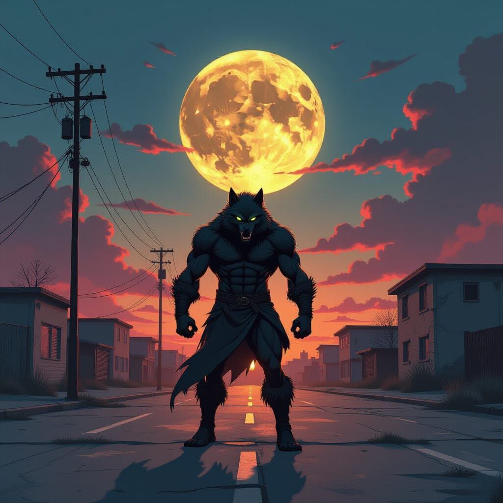 This image depicts a werewolf mid-transformation on a concrete street, bathed in volumetric twilight. Rendered with vivid colors and a cel-shaded aesthetic, it features golden hour hues and a zombiecore feel.