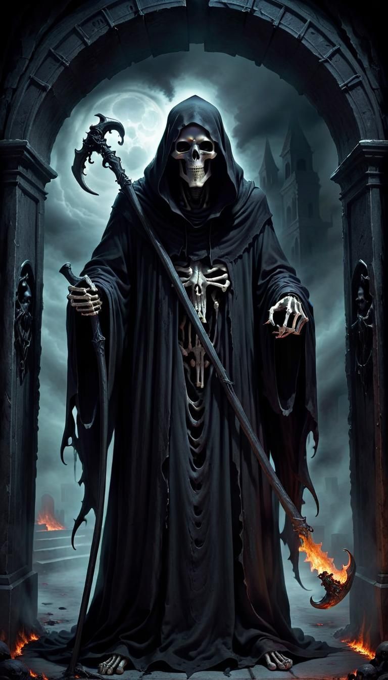 This image depicts a spectral Grim Reaper guarding the entrance to hell, awaiting lost souls. The scene evokes a sense of dread and foreboding.