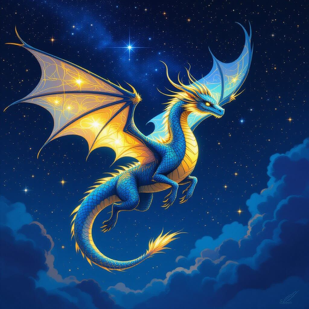A stunning celestial dragon ascends through a vibrant night sky. The dragon's scales mirror the stars, rendered in radiant blues and golds with a touch of mystical realism.