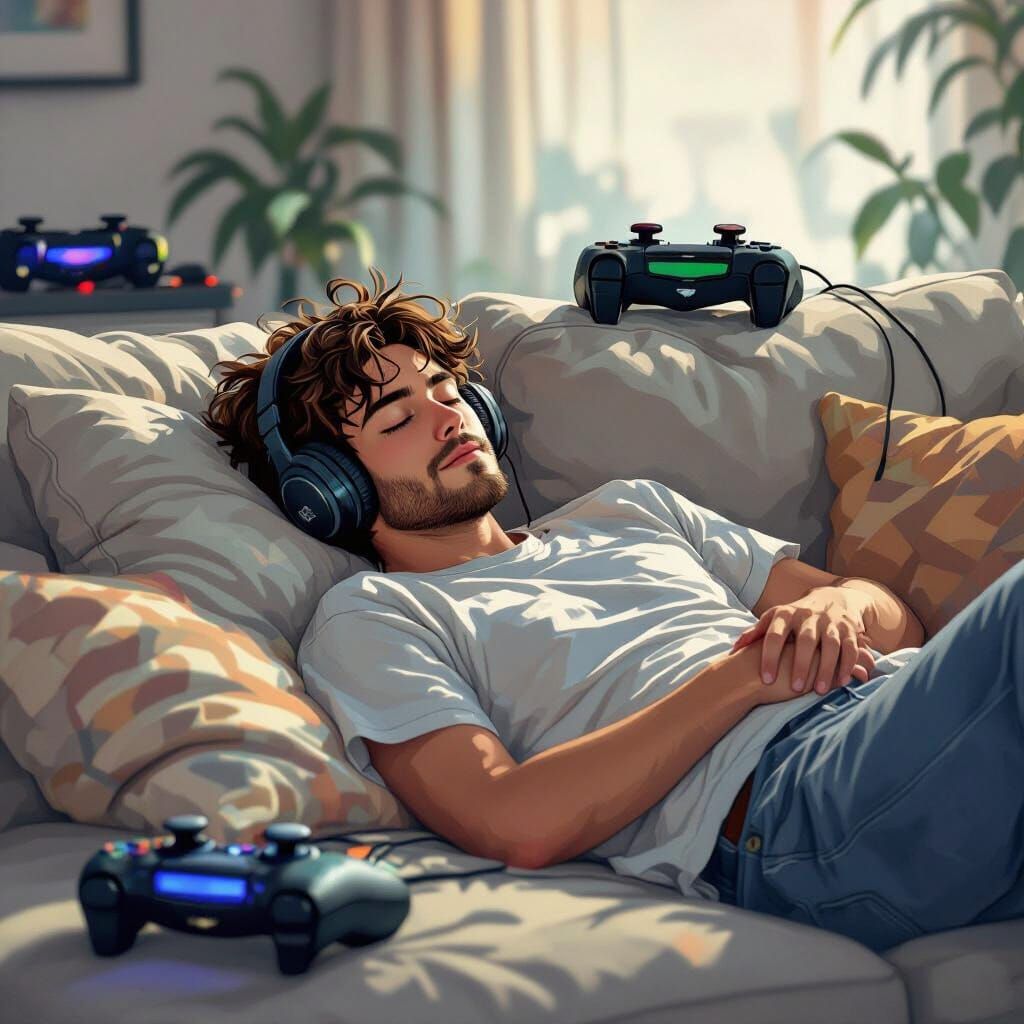 This image shows Henry sleeping on a couch, surrounded by blurred gaming equipment. The scene evokes a serene atmosphere, reminiscent of digital art and illustration.