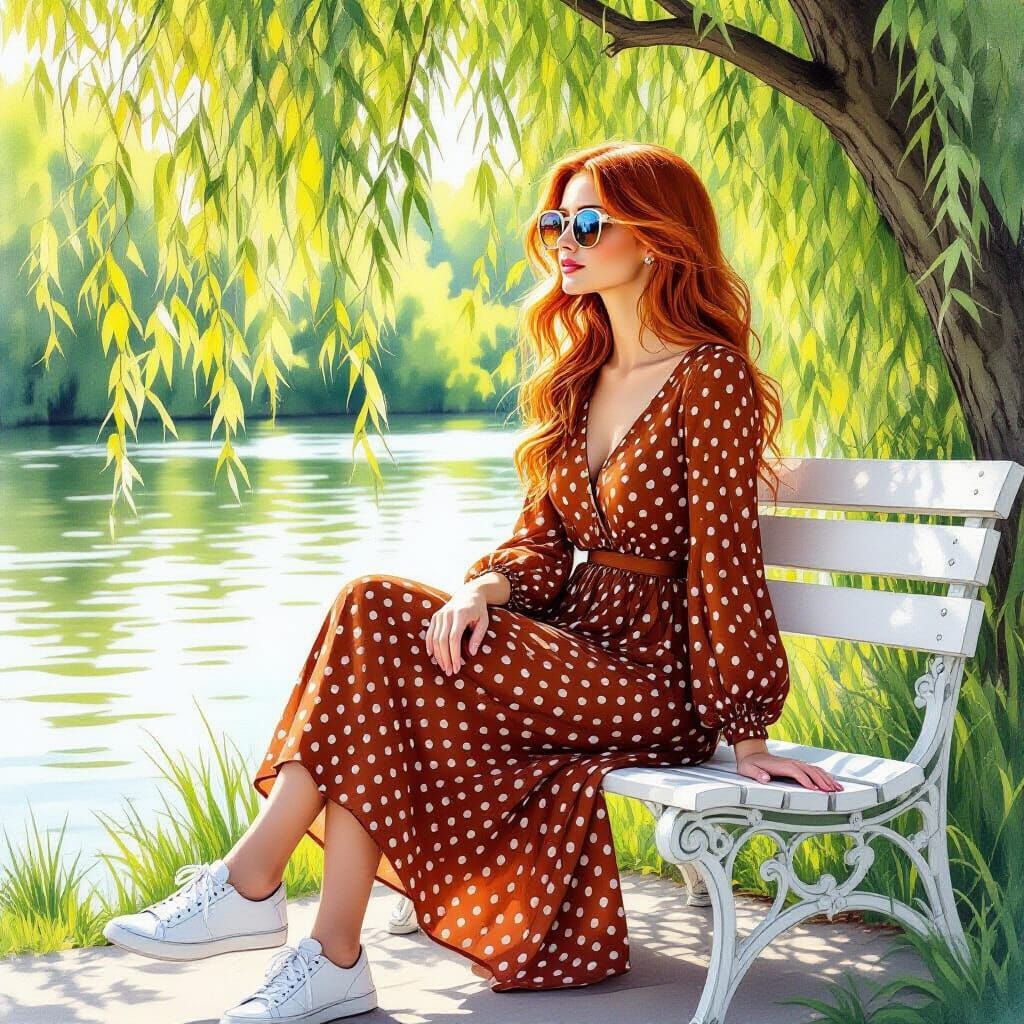 This image shows a red-haired woman in a polka dot dress sitting on a bench by a river. Sunlight filters through the trees, creating colorful patterns in this photorealistic watercolor painting.
