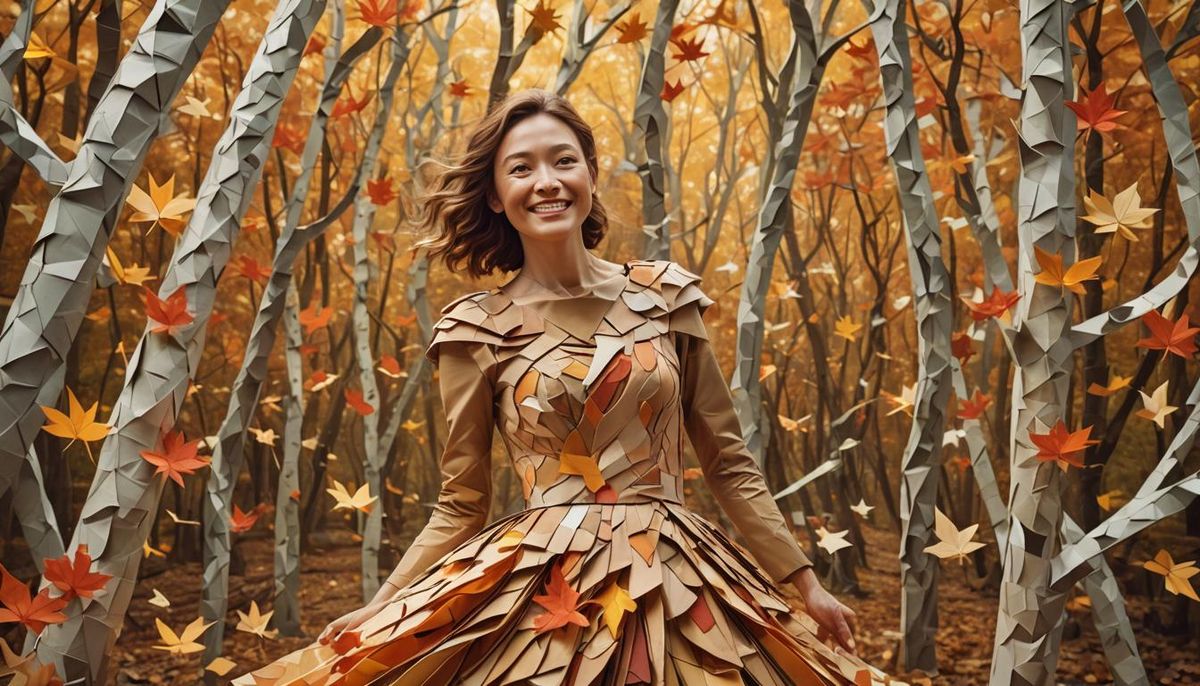 This image shows a smiling woman in a paper dress surrounded by autumn leaves in a forest. The surreal composition evokes dreamlike qualities using warm colors and soft focus.