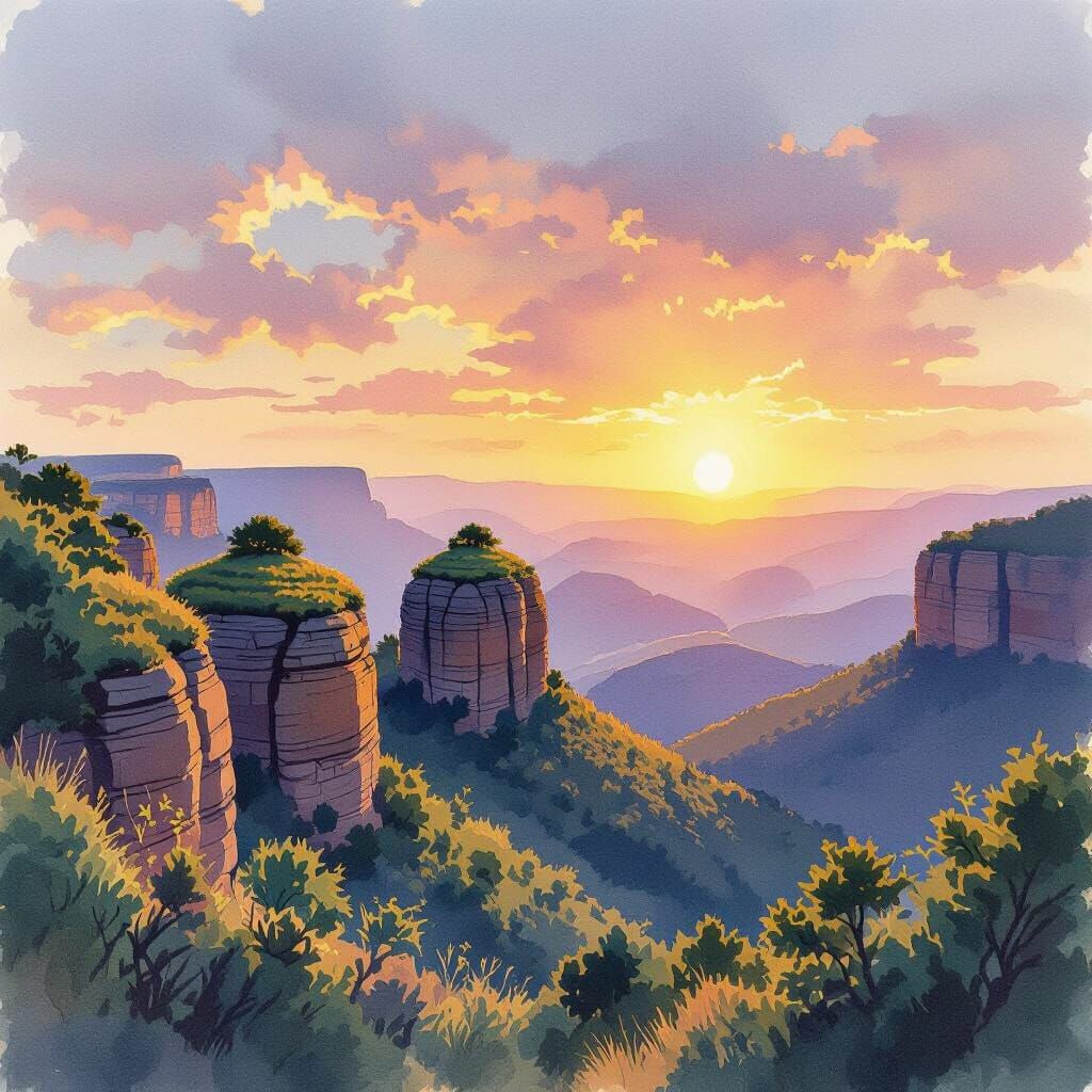 A watercolor image of the Three Rondavels in South Africa at sunset. The cylindrical rock formations are topped with green grass, painted with expressive brushstrokes in a dreamy style.