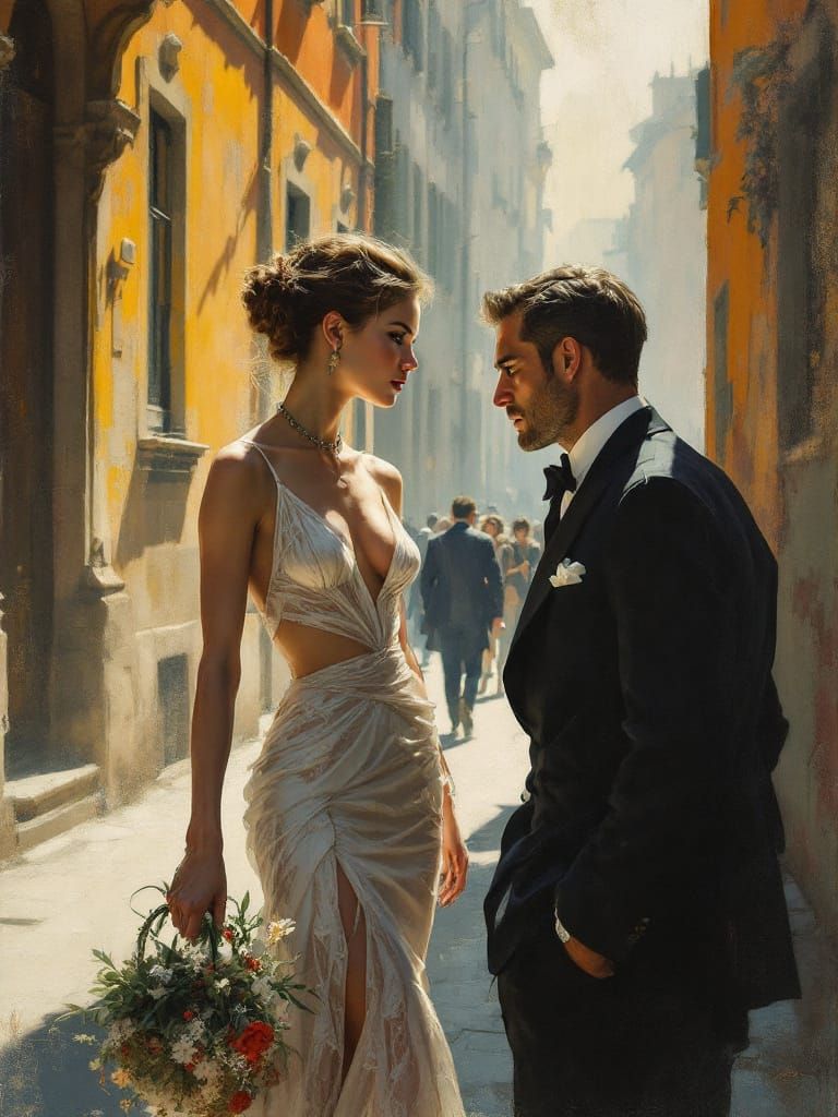 A classic figure study of an Italian woman on a Rome street, rendered with thick impasto and dramatic lighting, evoking 1950s sci-fi cover art.