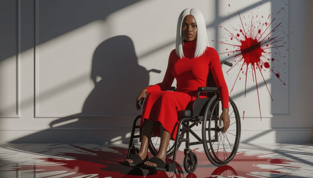 A hyperrealistic portrait of a scared African woman in a red turtleneck, seated in a wheelchair in a luxurious apartment. Intense shadow and blood splatter create a chilling atmosphere.