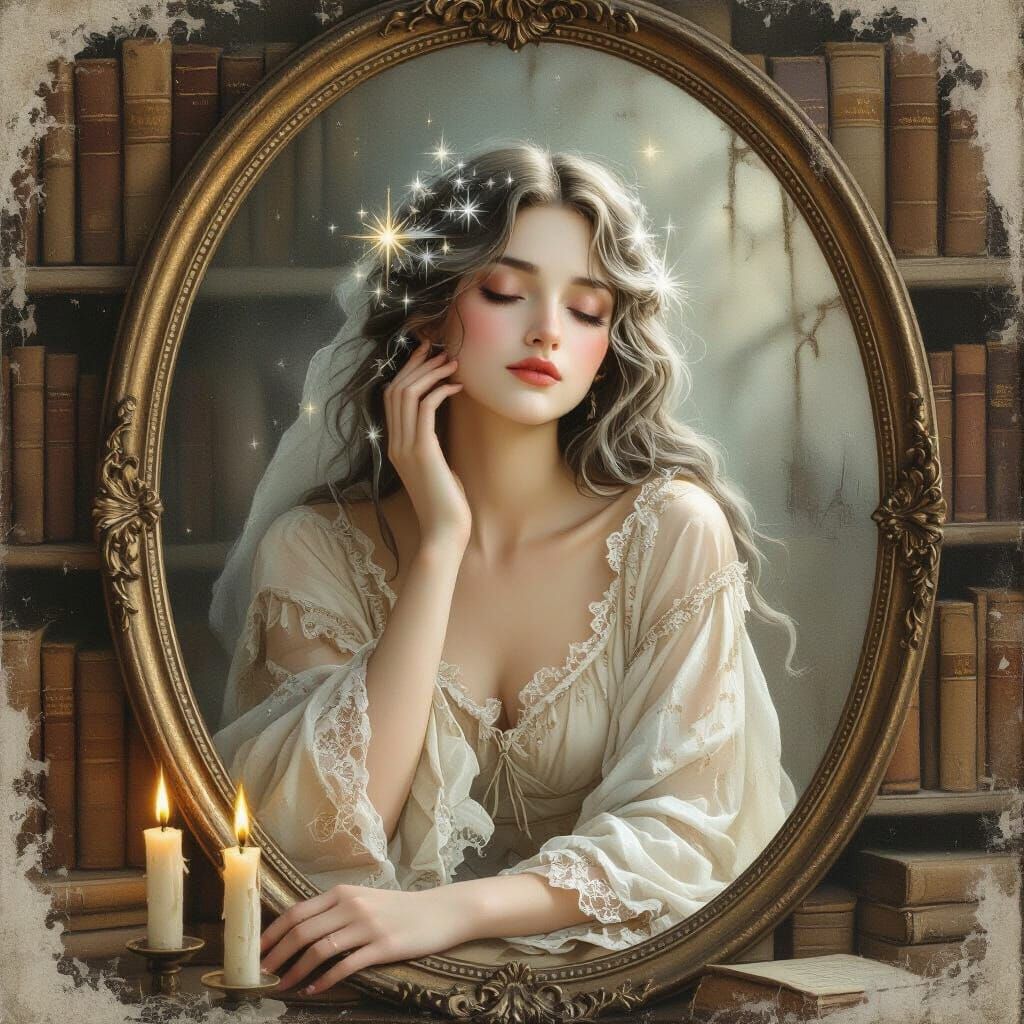 This image shows a serene muse with closed eyes, framed in an oval vintage setting. The portrait features soft, ethereal light and intricate details, reminiscent of classical and fantasy art with muted colors.