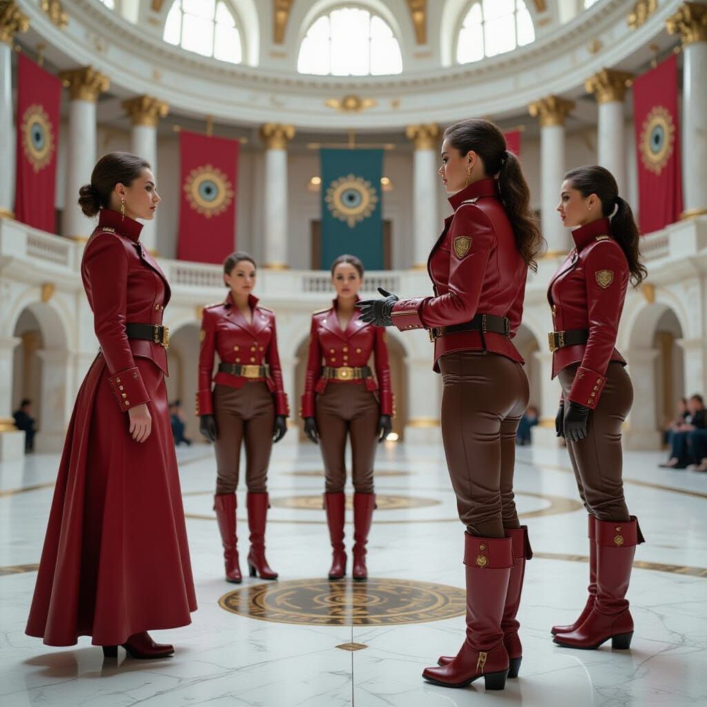 This image shows female soldiers in steampunk-inspired attire amidst intricate gears and brass accents. They stand in a grand marble arena while being addressed by an older woman, rendered with industrial and Victorian elements.