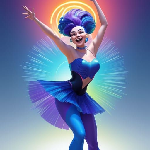 This 3D digital art showcases a woman dancing with a joyful expression. Features cinematic lighting and a bright gradient background, in a modern animation style.