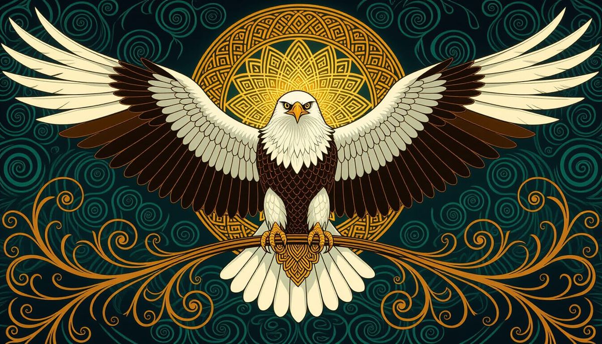 A striking picture of a white, brown, and black fish eagle perched on a golden branch. A glowing Celtic mandala with Byzantine influences radiates behind the eagle, set against swirling patterns in teal, sapphire and bronze in an Art Nouveau style.