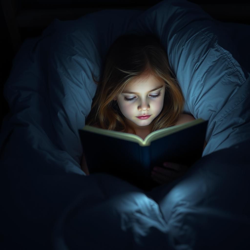 Young girl reading in bed with a flashlight under the covers late at night after she's supposed to be asleep intricate details, HDR, beautifully shot, hyperrealistic, sharp focus, 64 megapixels, perfect composition, high contrast, cinematic, atmospheric, moody