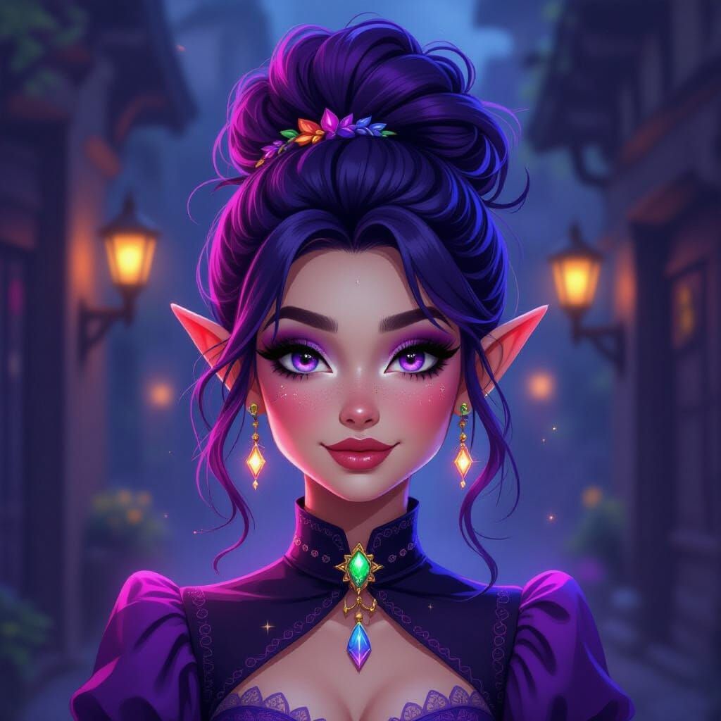 This image shows a tall rainbow updo hairstyle in a dimly lit magical shop. The image has a bright, shimmering, glittery aesthetic, reminiscent of a cartoon style.