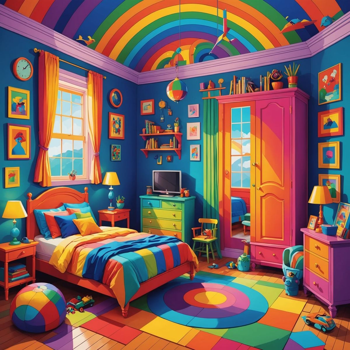 Create your own vibrant, maximalist kids' rooms with our free AI image generator. It's easy and fun!