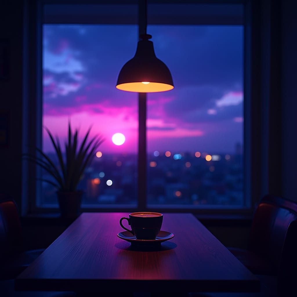 This image captures a moody, modern night cafe interior illuminated by a dramatic 'neon sunset' outside, blending twilight blue with vibrant magenta and electric cyan hues. Cinematic, immersive, and photographic.