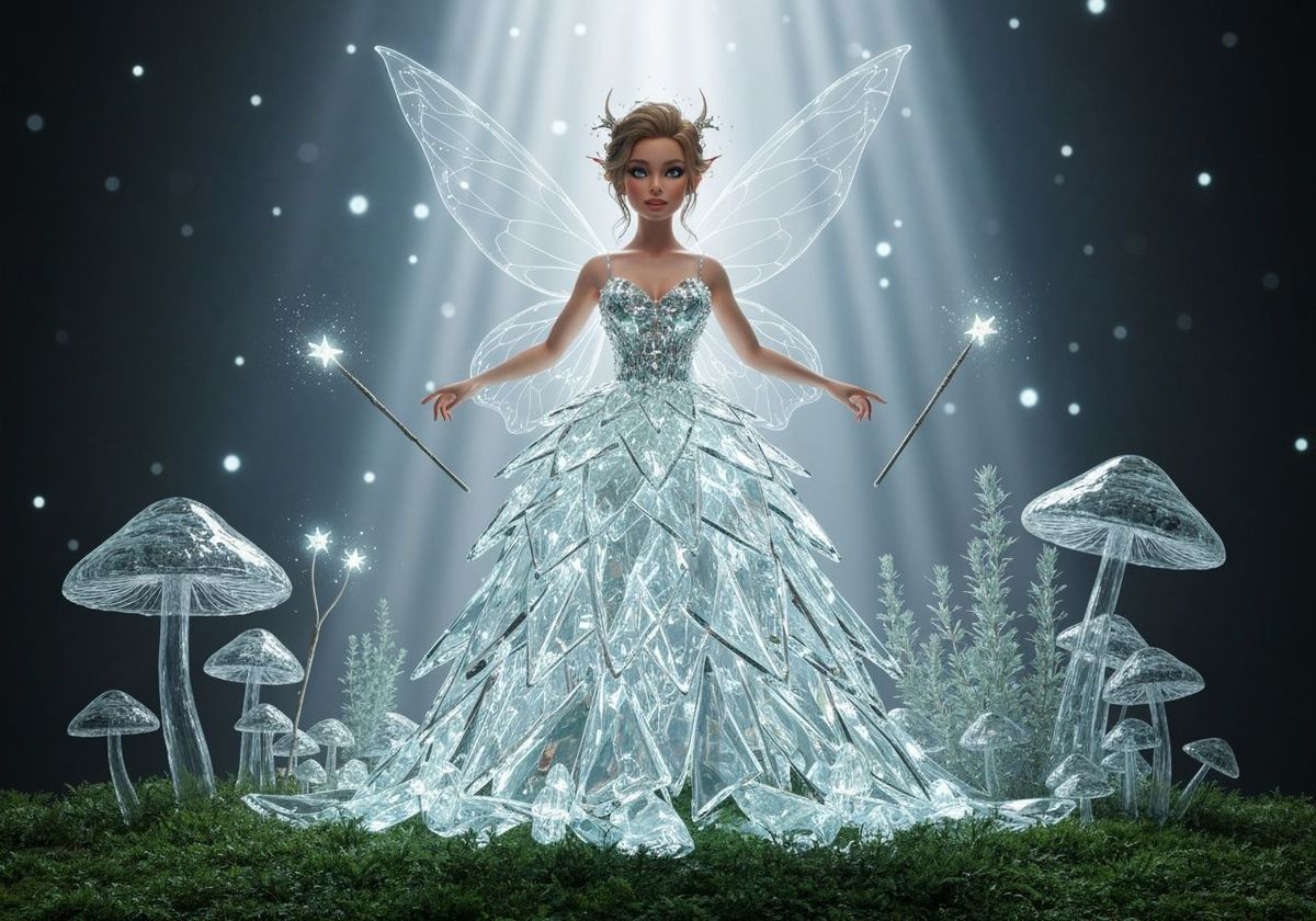 This image features a detailed pixie adorned in a luminous, multi-layered glass shard dress. Reflective mushrooms and magical elements enhance the scene, rendered with soft, dramatic lighting and bokeh effects.