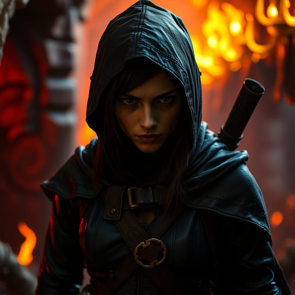 This image shows a cunning Tiefling thief navigating the fiery underworld, avoiding hellish encounters with piercing eyes and a hint of mischief. Rendered in a gritty, cinematic style with a warm filmic texture and subtle film grain.