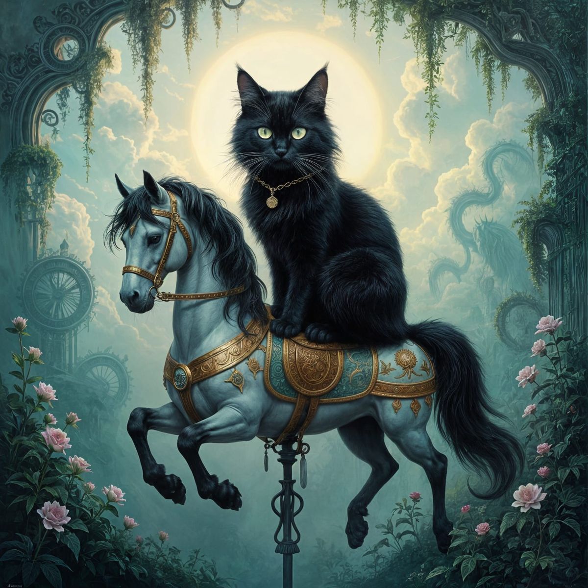 This oil painting depicts a black cat with glowing eyes on a vintage carousel horse in a dreamlike, surreal landscape. The artwork features intricate details and a mystical, enchanting atmosphere.