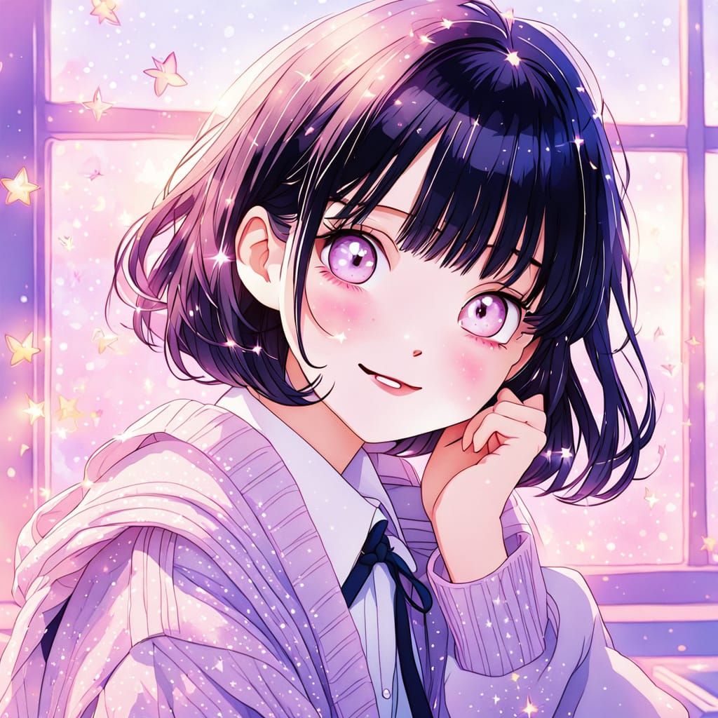This image shows a young anime girl with short black hair and a playful expression, wearing a cardigan over her school uniform in soft pastel tones, with a whimsical and dreamy quality.